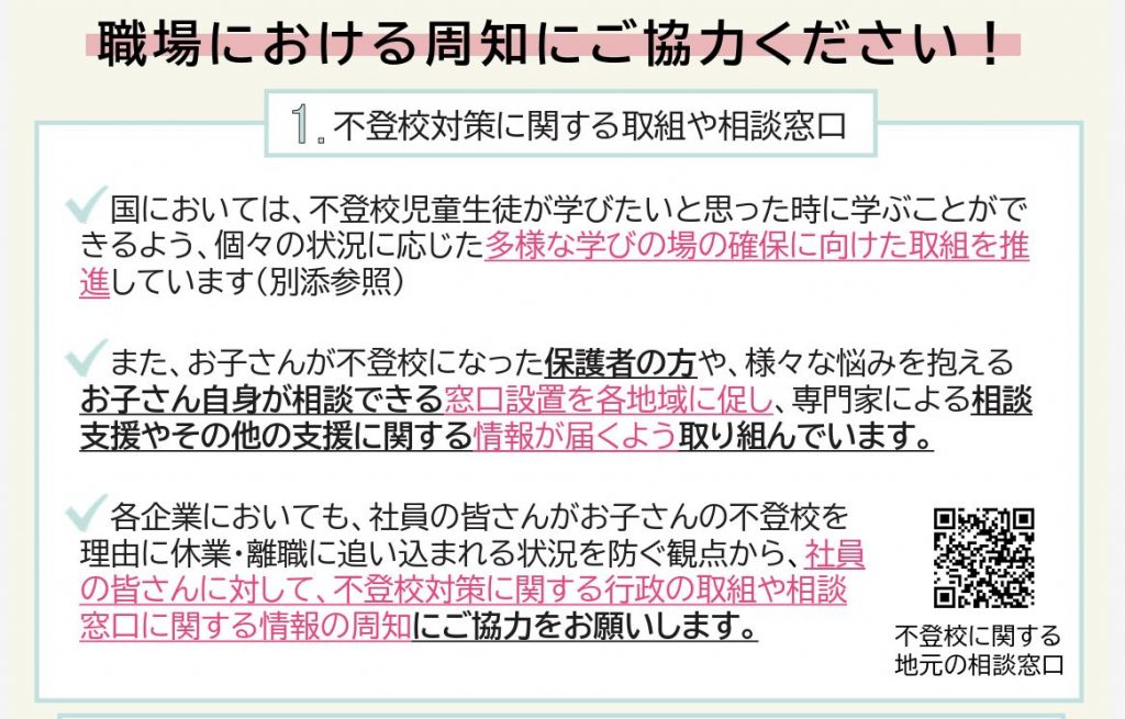 従業員が子どもの不登校で困ったとき、早めに支援につながるよう、事業所での情報共有にご協力ください。