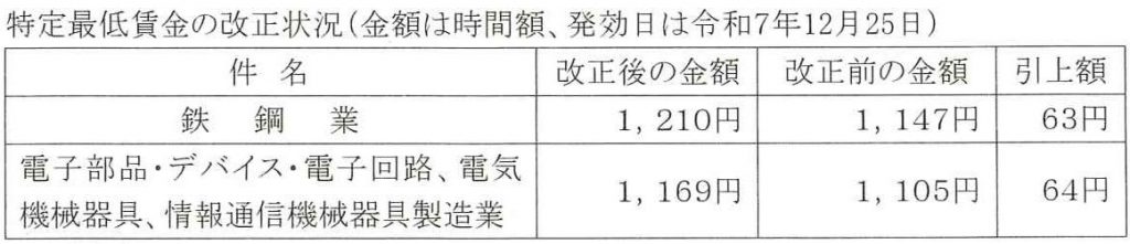 千葉県特定(産業別)最低賃金は、下記表のとおり、2業種について金額の改正が行われ、令和7年12月25日から適用されます。