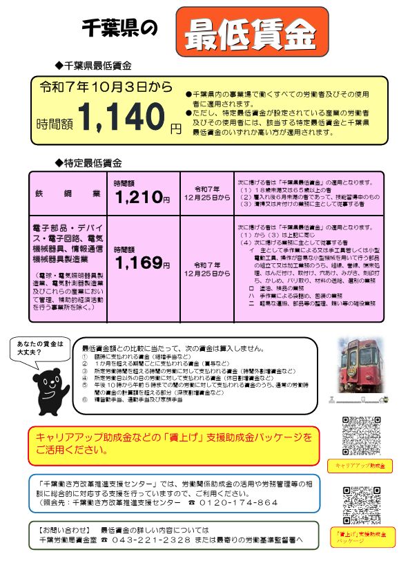 「千葉県最低賃金」が令和7年10月3日から時間額1,140円(従来の1,076円から64円引上げ)に改正されます。千葉県内の事業場で働くすべての労働者(パート、アルバイト等を含む。)及び、その使用者に適用される千葉県最低賃金(地域別最低賃金)が改正されます。