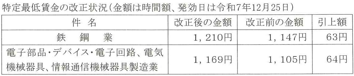 千葉県特定(産業別)最低賃金は、下記表のとおり、2業種について金額の改正が行われ、令和7年12月25日から適用されます。