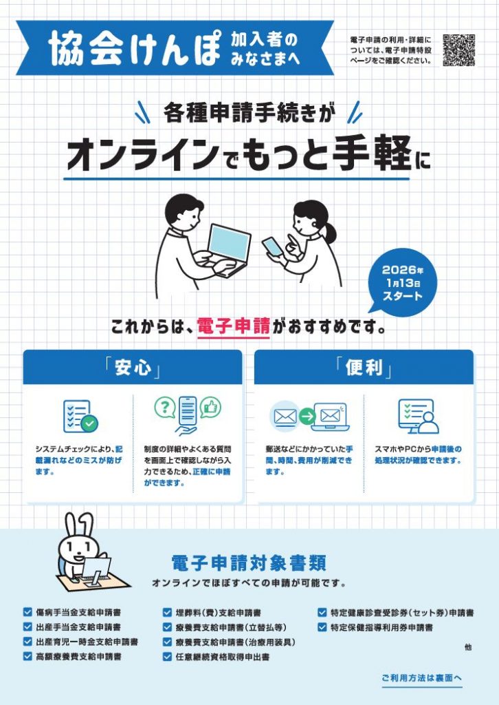 協会けんぽでは、加入者の使いやすさ向上と事務手続きの効率化のため、2026年1月13日から各種申請がオンラインでできる「電子申請サービス」を開始します。