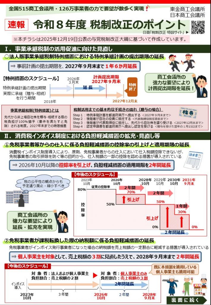 日本商工会議所では、2025年12月19日に公表された与党税制改正大綱を踏まえ、中小企業の皆さまに役立つ内容を整理した「令和8年度税制改正のポイント」をまとめました。