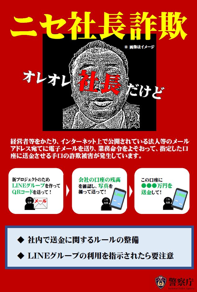 少しでも不審に感じたら、必ず本人や社内で事実確認を行い、単独判断で送金しないよう徹底してください。(警察庁より標記周知依頼)