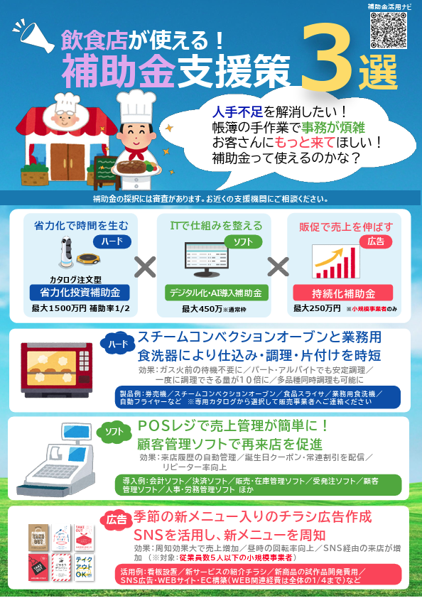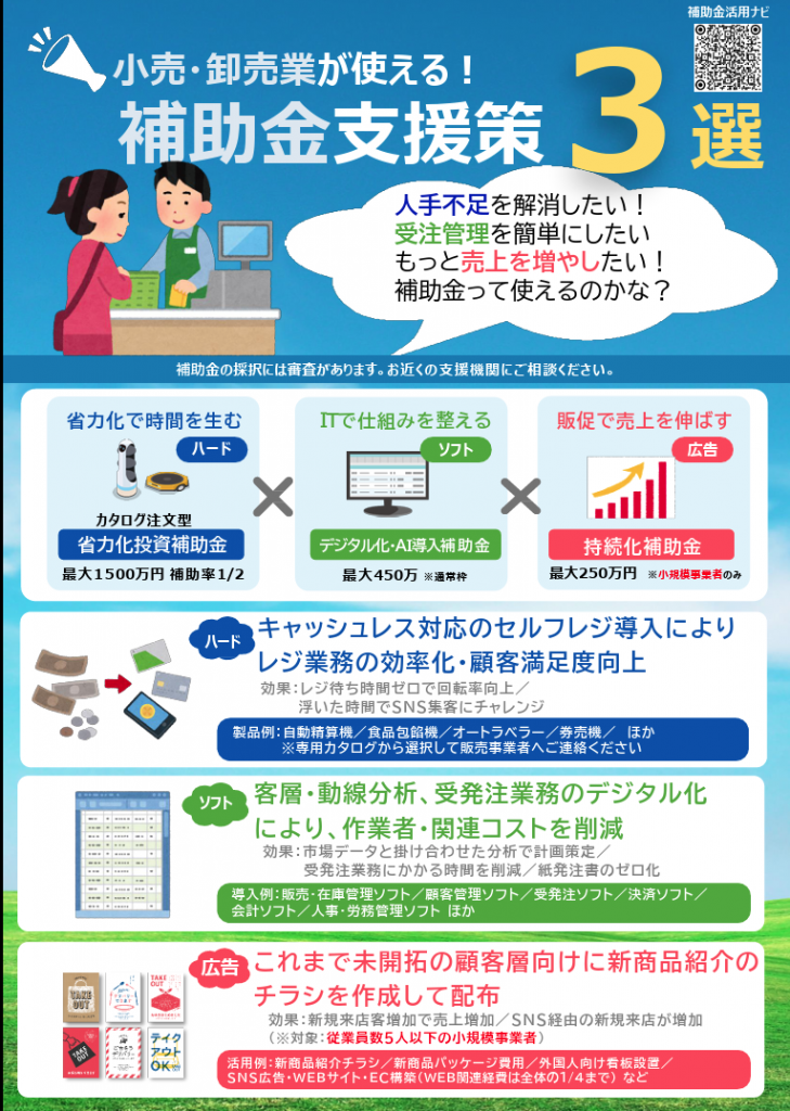 本チラシでは、「人手不足」「業務効率化」「販路開拓」など、事業者の皆さまが直面する課題に対し、実際の導入事例や活用可能な補助金制度を業種ごとに紹介しています。