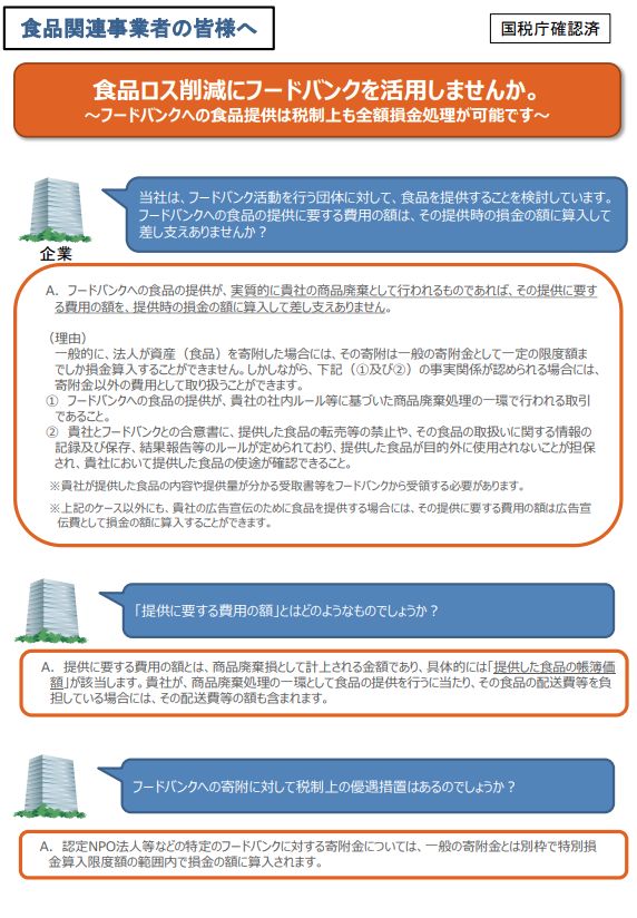消費者庁および農林水産省より、「フードバンクへ食品を提供した場合の税制上の取扱い」について周知依頼がありました。