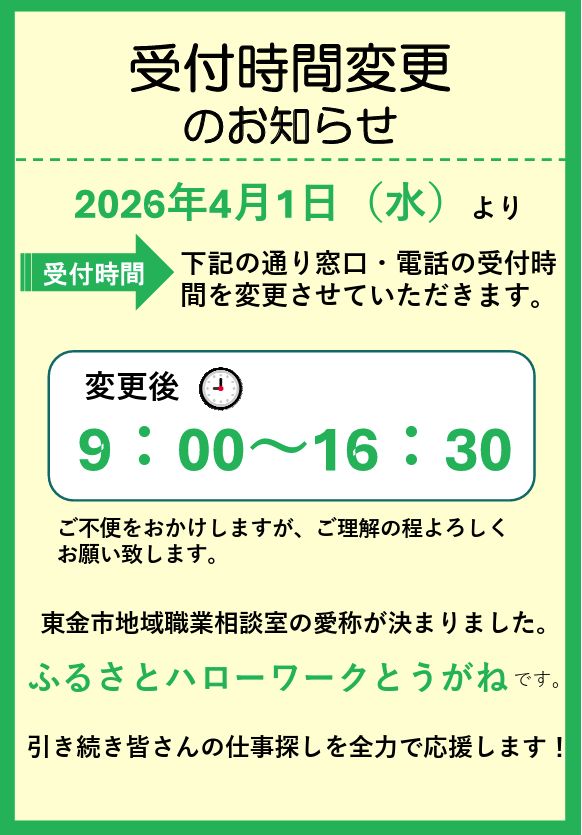 2026年4月1日(水)より、東金市役所の窓口時間変更に伴い、東金市地域職業相談室の受付時間が下記のとおり変更となります。