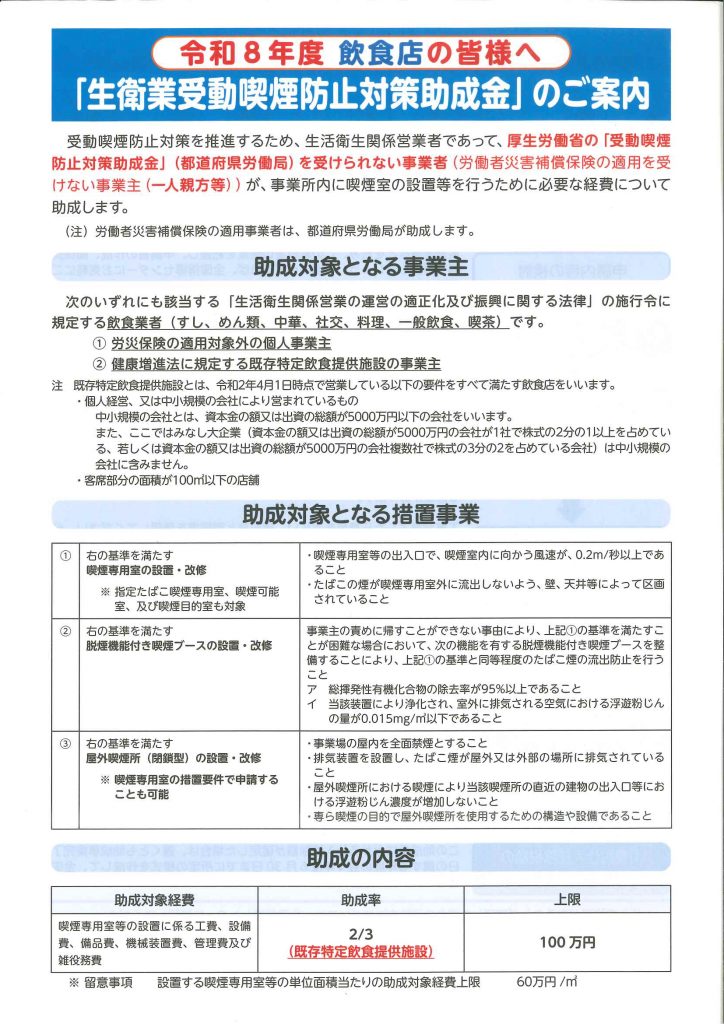 2026.04.13【飲食店の皆様へ】生衛業受動喫煙防止対策事業助成のご案内(令和8年度)