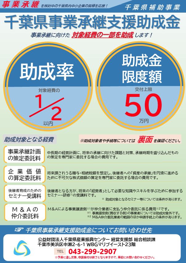 千葉県では事業承継に取り組む中小企業を対象に、計画策定や企業価値算定、後継者育成、M&A仲介費用などを支援します。助成率1/2、上限50万円。円滑な事業承継を進めるチャンスです。ぜひご活用ください!詳細は下記を参照ください。