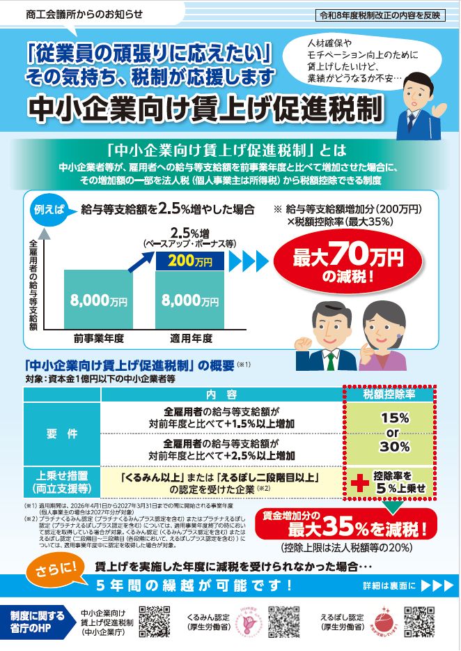 2026.04.02【R8年度税制改正チラシ第2弾】中小企業向け賃上げ促進税制の周知チラシのご案内 公開日: 2026年4月2日 | 投稿者: 指導課 【R8年度税制改正チラシ第2弾】 中小企業向け賃上げ促進税制の周知チラシのご案内 中小企業向け賃上げ促進税制の令和8年度のチラシをご案内します。業員の給与等を一定以上引き上げた場合、増加額の一部を法人税等から控除できる制度で、企業の賃上げと人材確保を後押しします。要件や控除率の拡充内容についても分かりやすく解説しています。持続的な成長と従業員待遇の向上に向け、ぜひ本制度の活用をご検討ください。 ▶中小企業向け賃上げ促進税制の周知チラシ(PDF) こちら ▶国税庁庁ホームページ こちら
